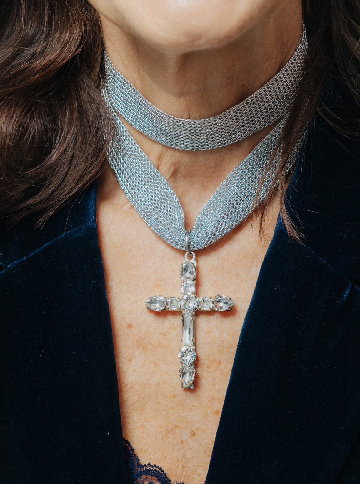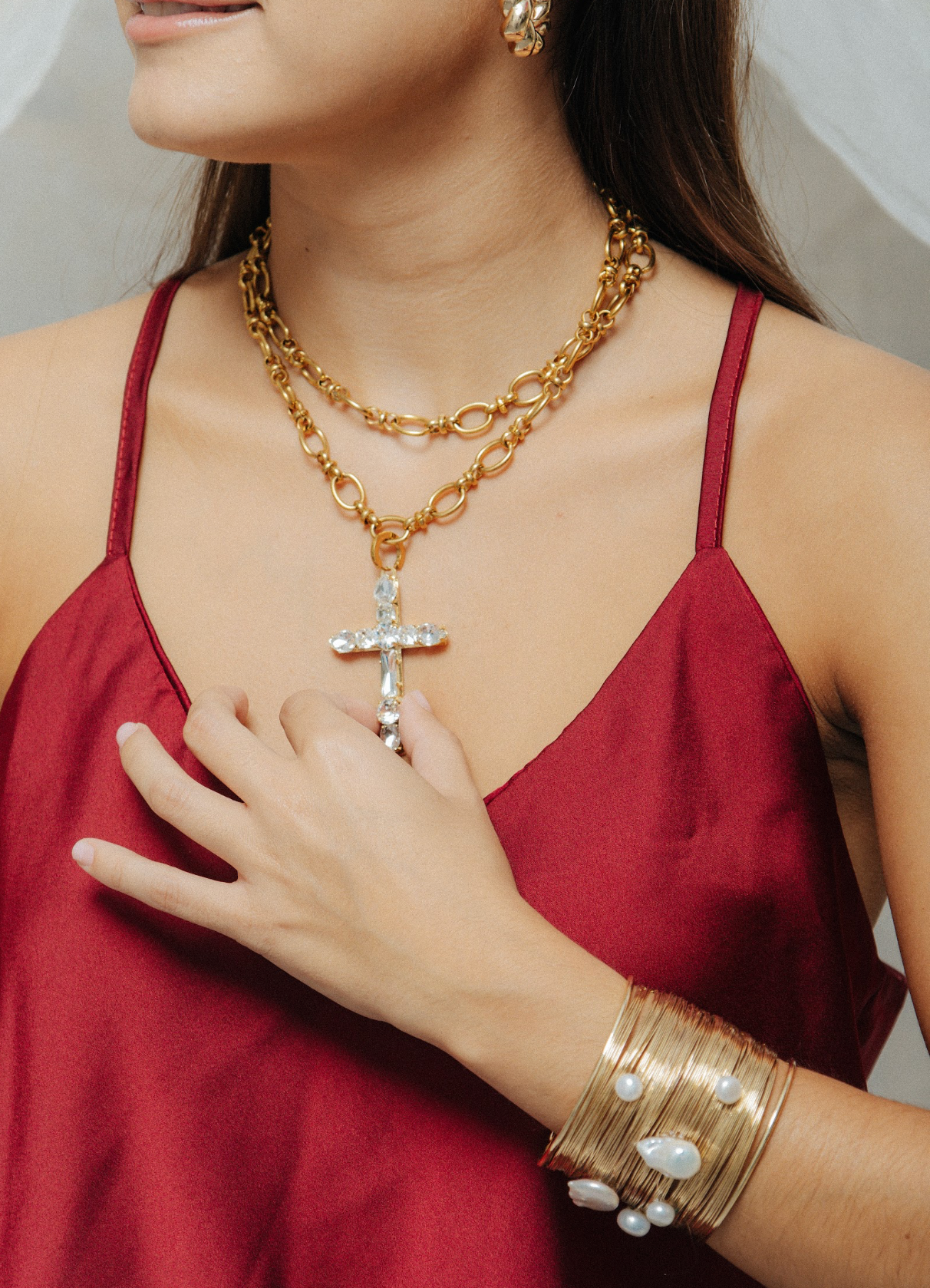 El diseño permite combinarlo con diferentes gargantillas o cadenas —como la Gargantilla Aro o la Malla Metalizada Plana— para adaptarse a cualquier estilo.