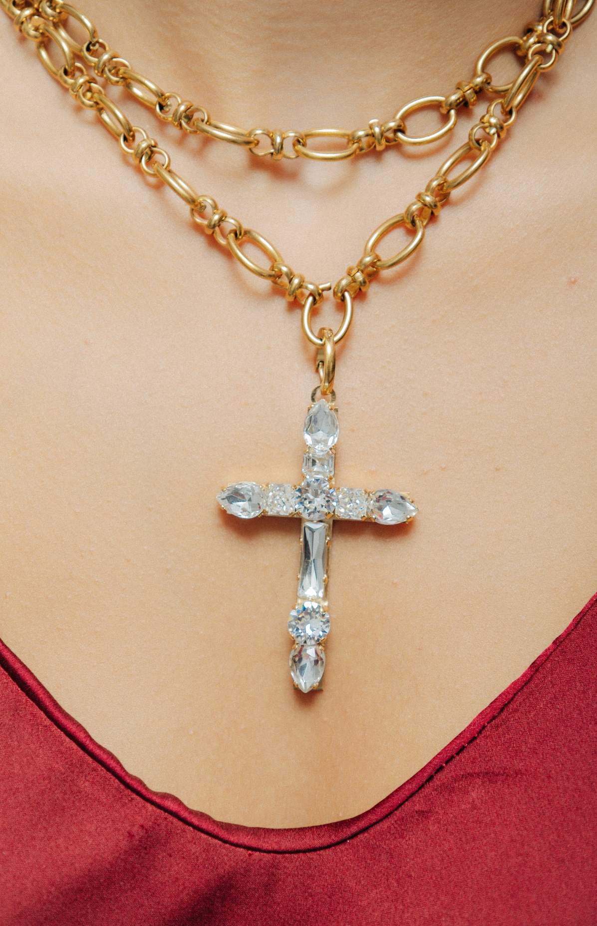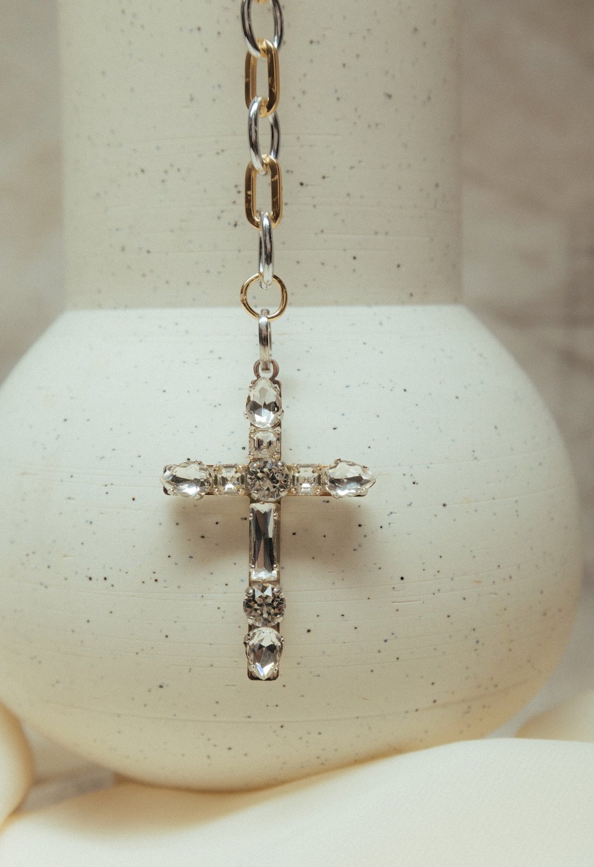 Su espectacular cristal Swarovski®, tallado con precisión y montado sobre un portacolgantes de strass, crea una composición luminosa y elegante.