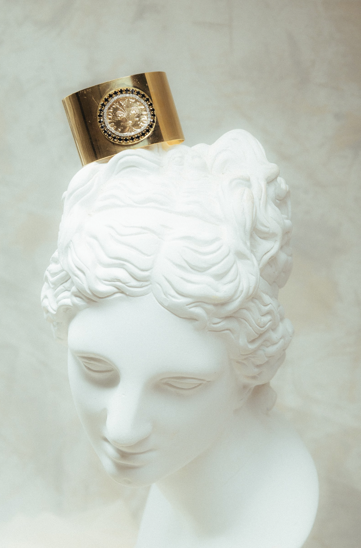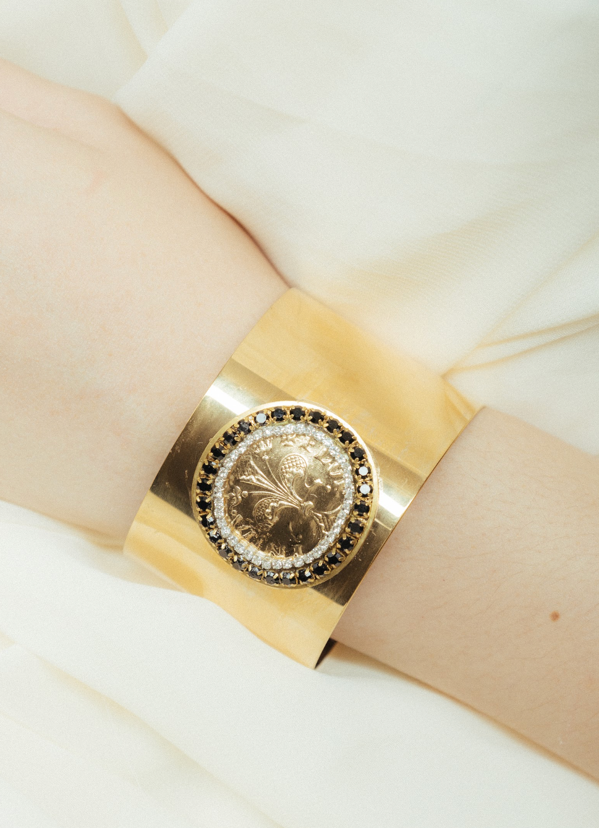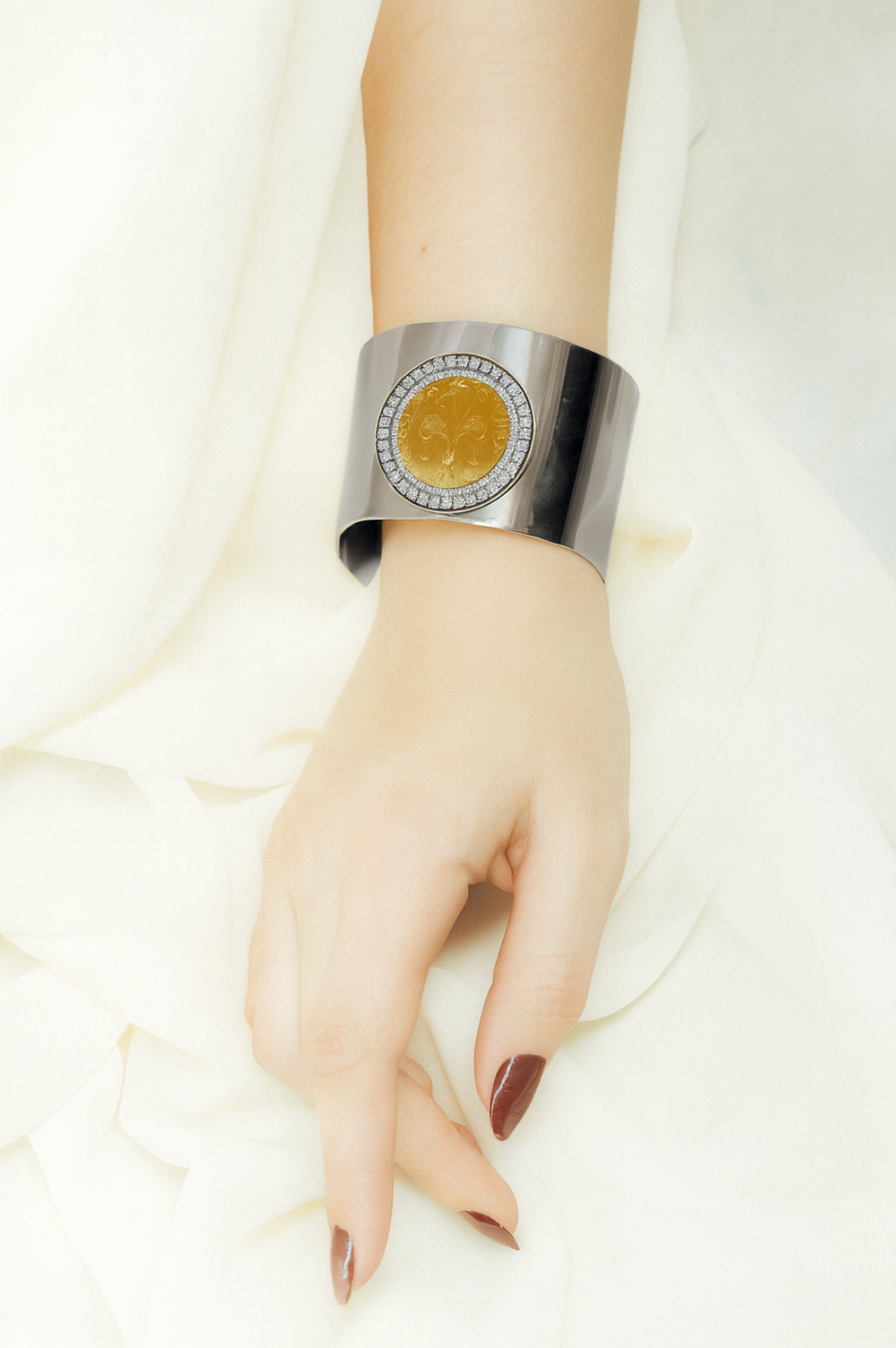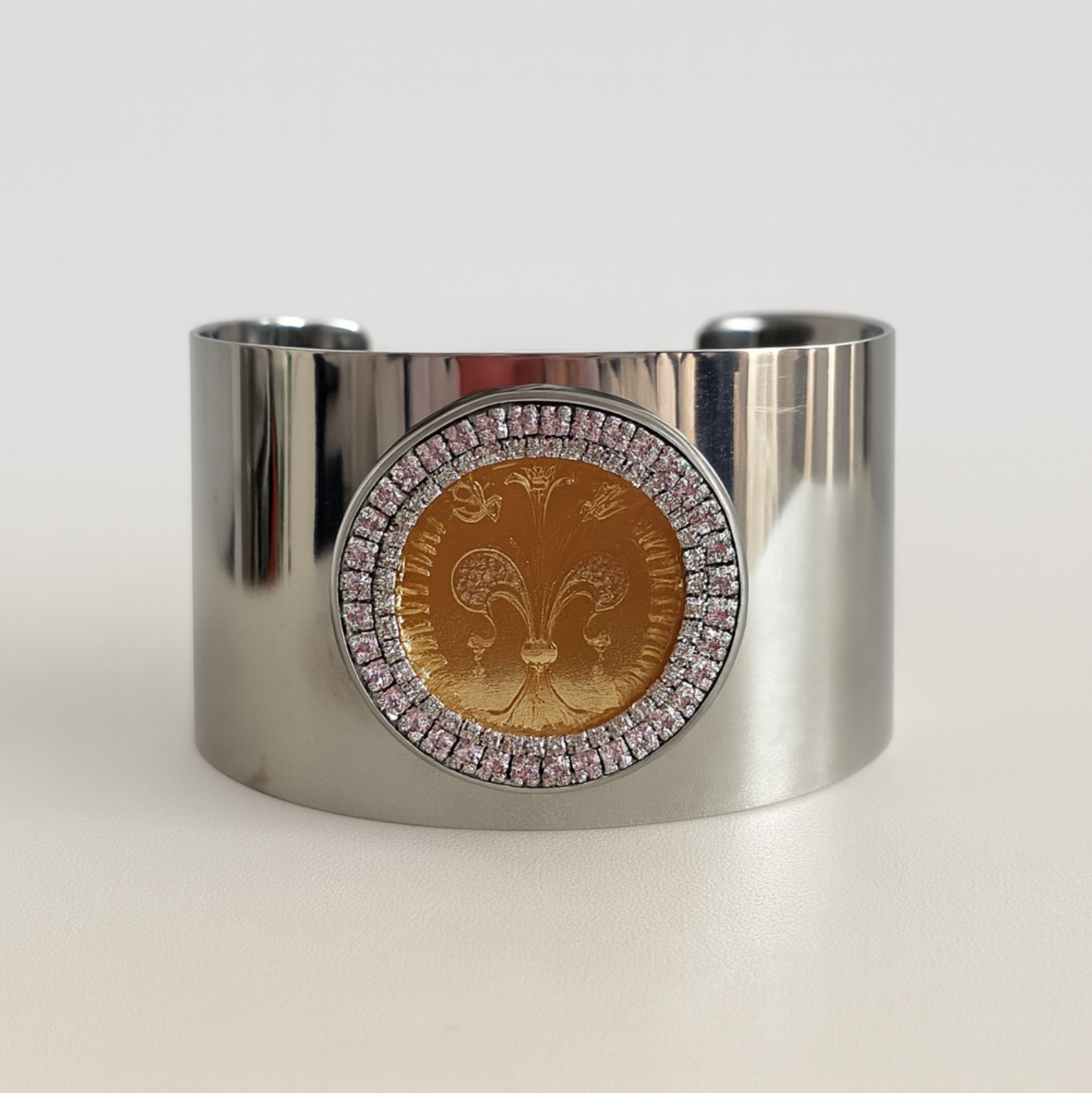 La Esclava Florín es una joya majestuosa que combina el brillo del oro con la fuerza del símbolo histórico del florín de Florencia.