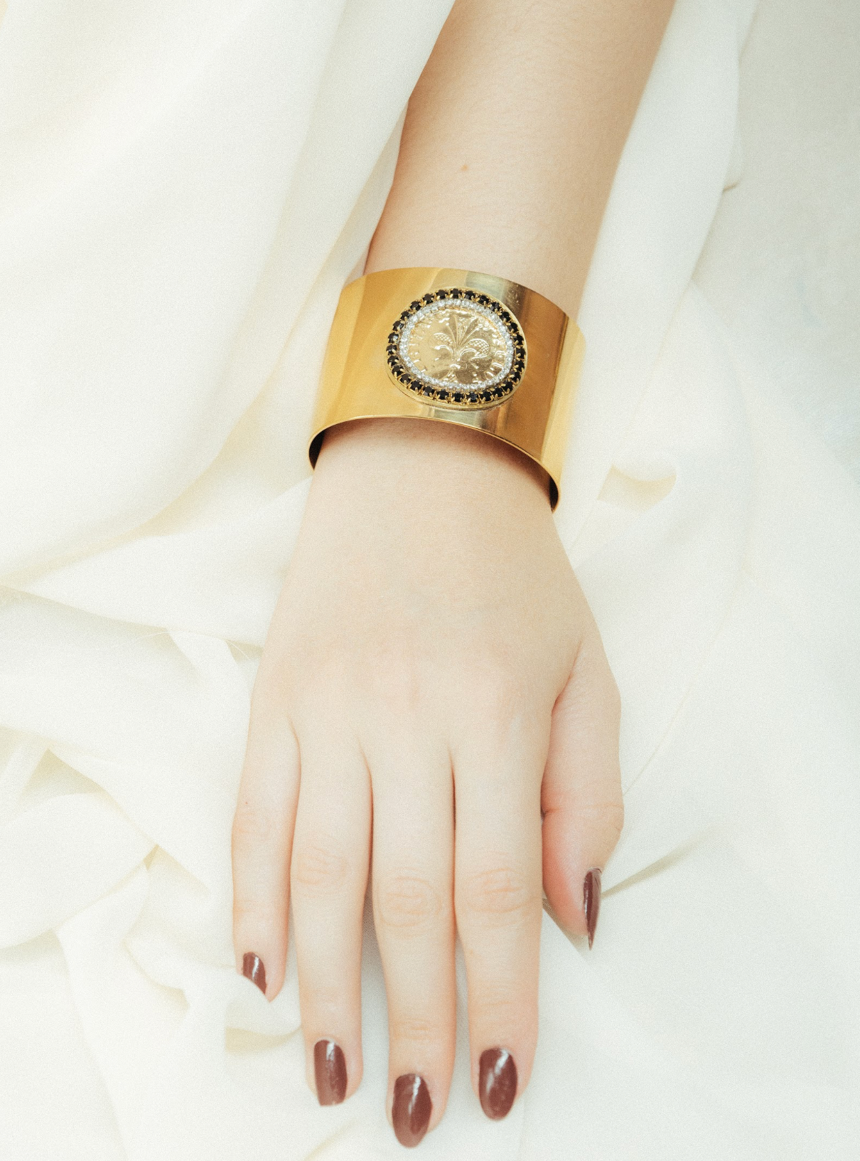 Su diseño destaca por un medallón central acabado en pan de oro en relieve, enmarcado por un doble aro de cristales pavé negros y transparentes, que crean un contraste elegante y contemporáneo.