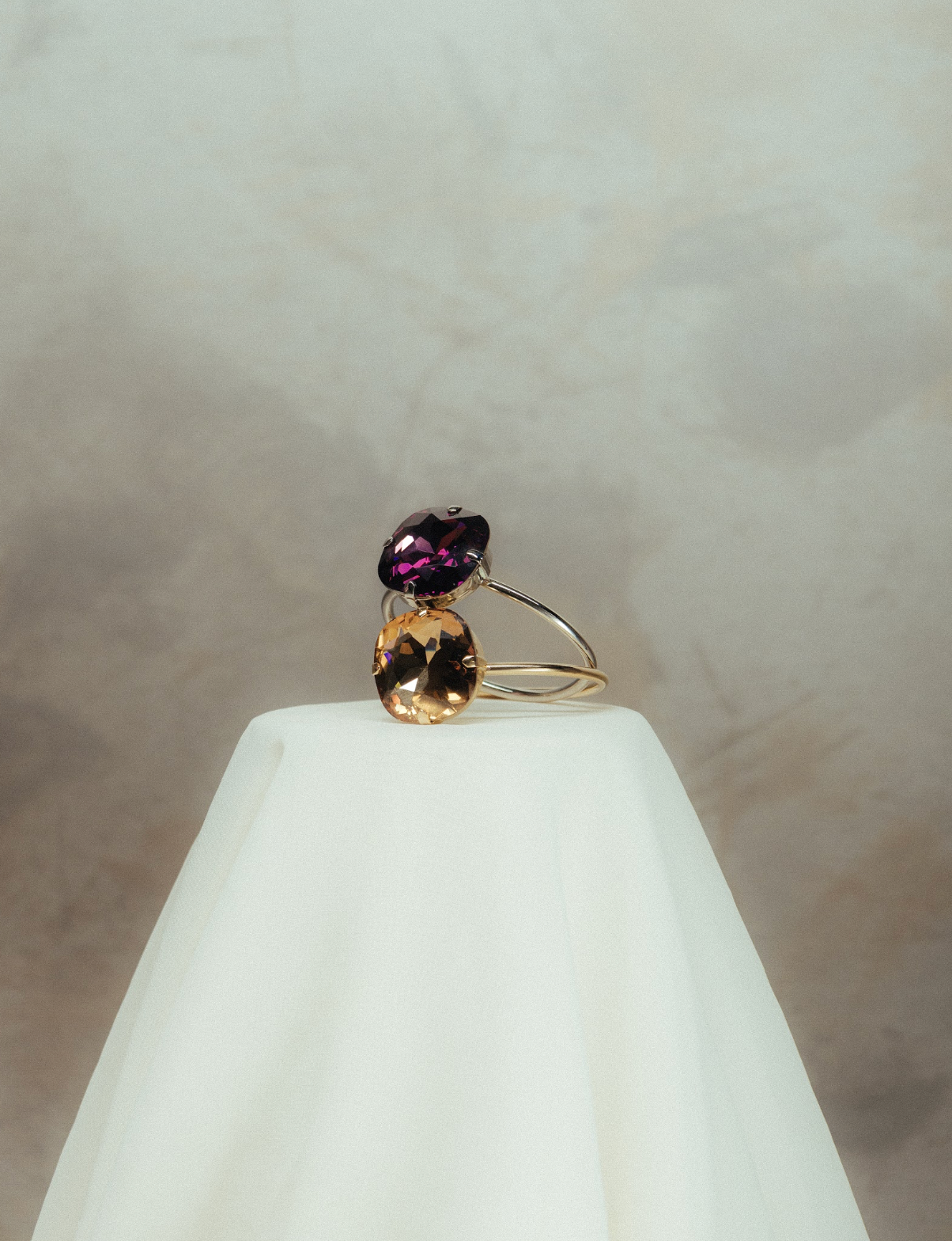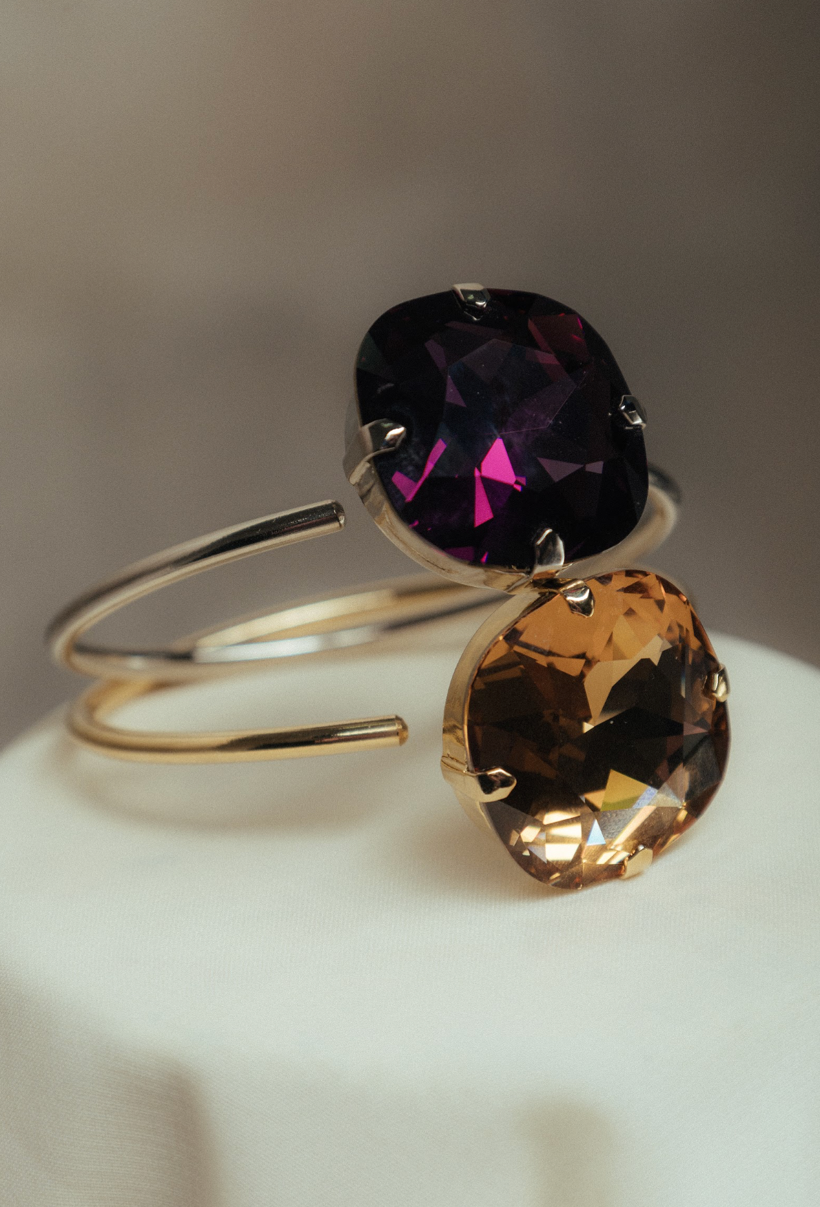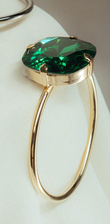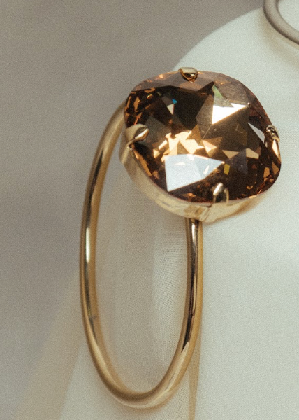 Su cristal Swarovski® talla XL, montado sobre una base metálica bañada en oro o plata, crea un efecto hipnótico y majestuoso.