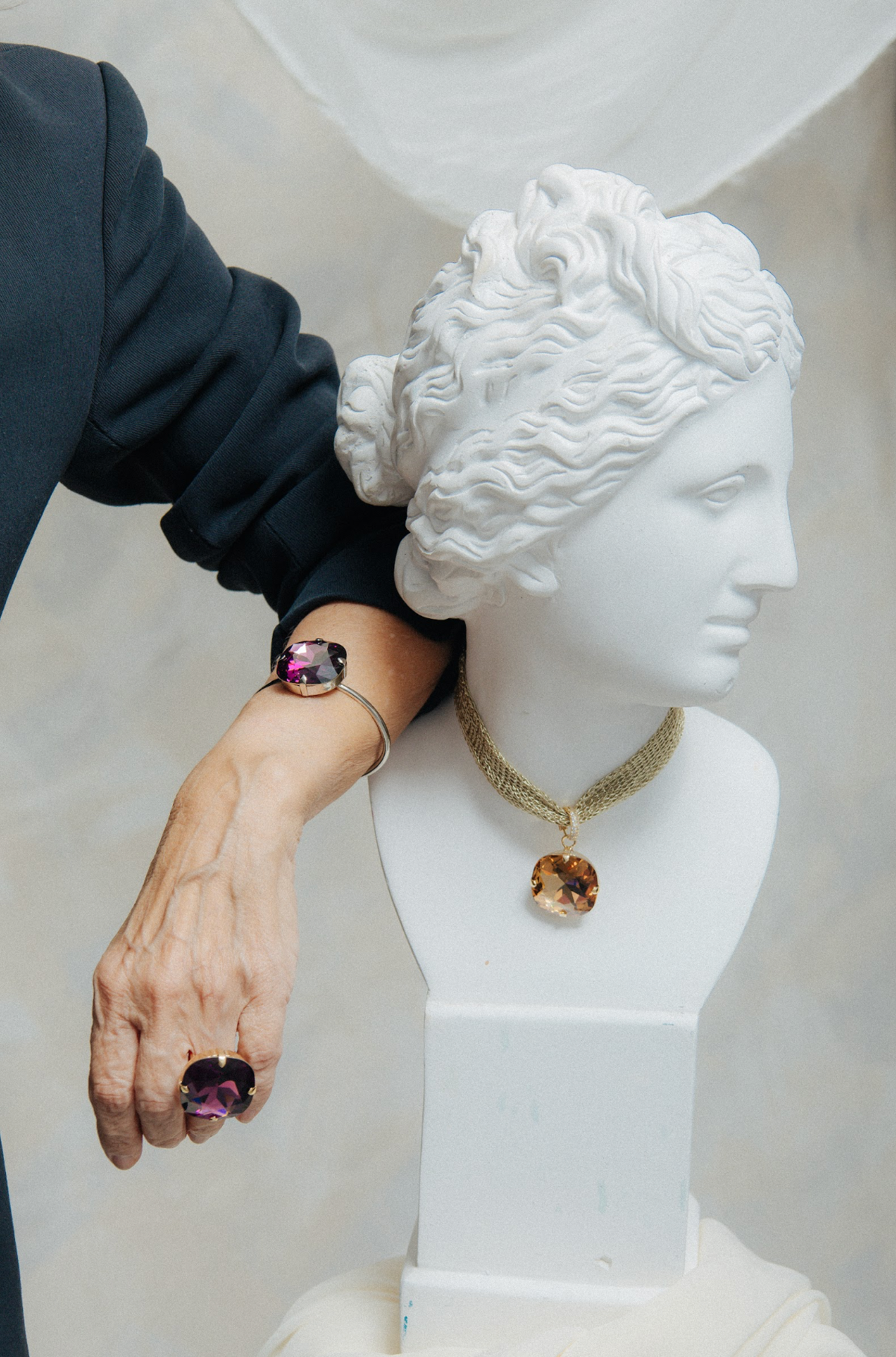 Su cristal Swarovski® talla XL, montado sobre una base metálica bañada en oro o plata, crea un efecto hipnótico y majestuoso.