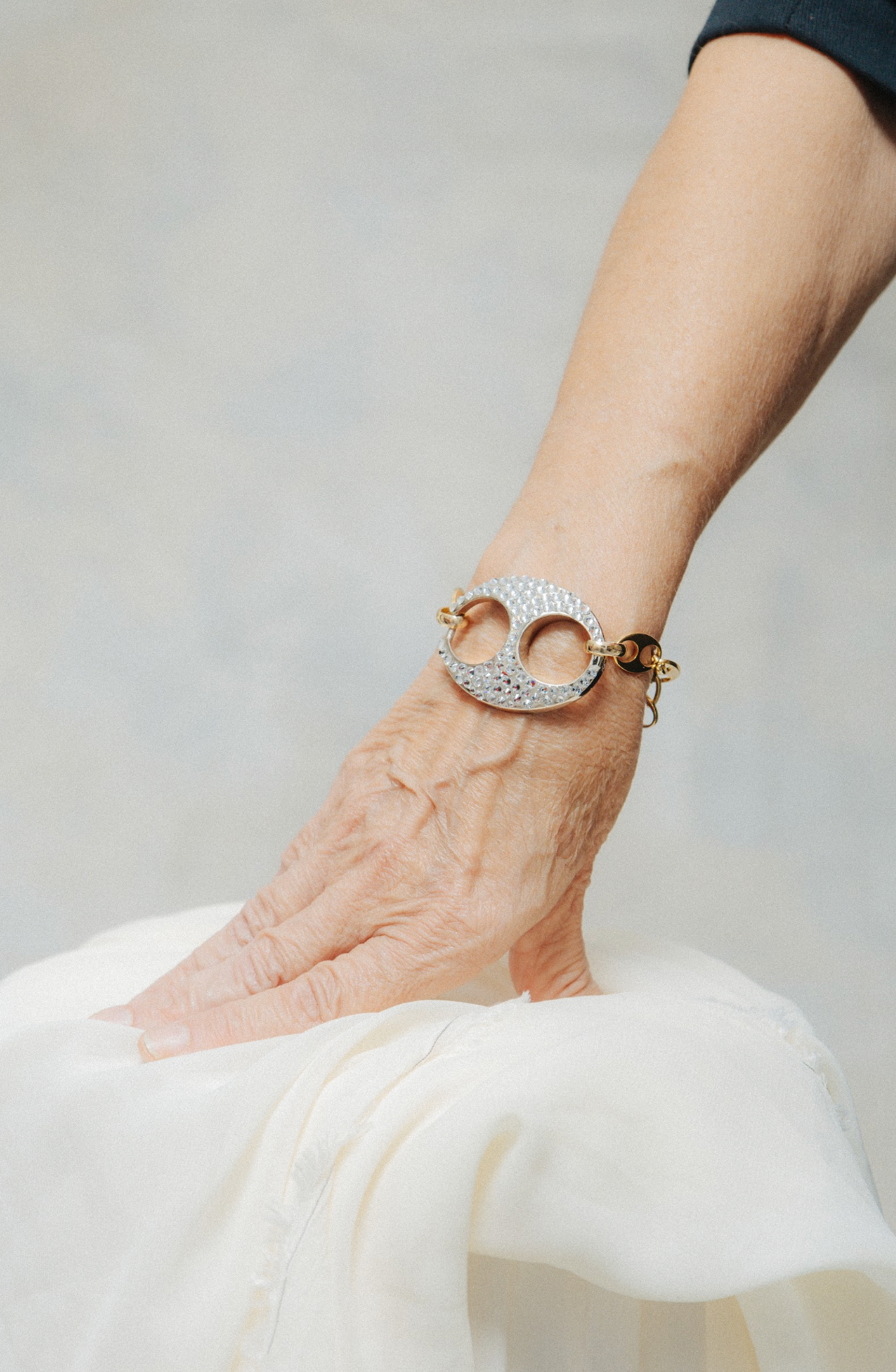 Pulsera de eslabones calabrote, uno pulido y otro con pavé de cristales. Una pieza escultural que mezcla el brillo y la sobriedad en perfecta armonía.